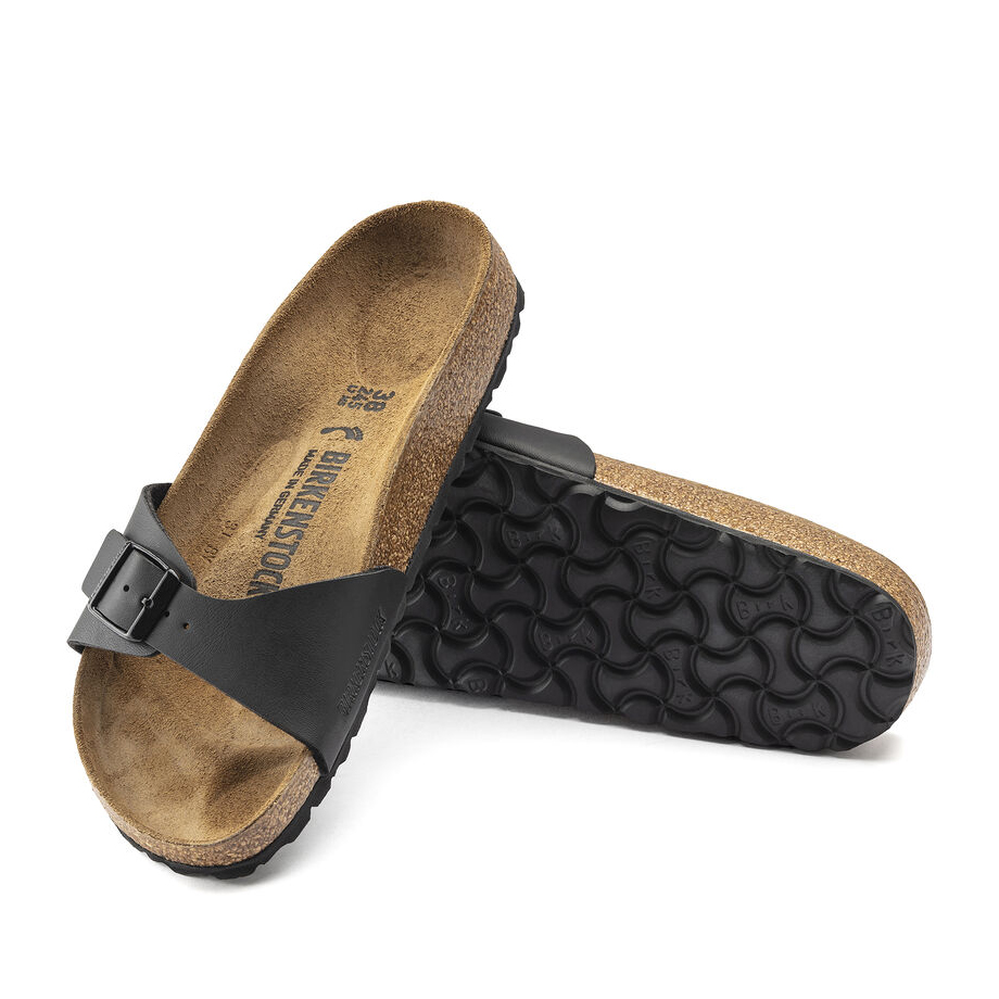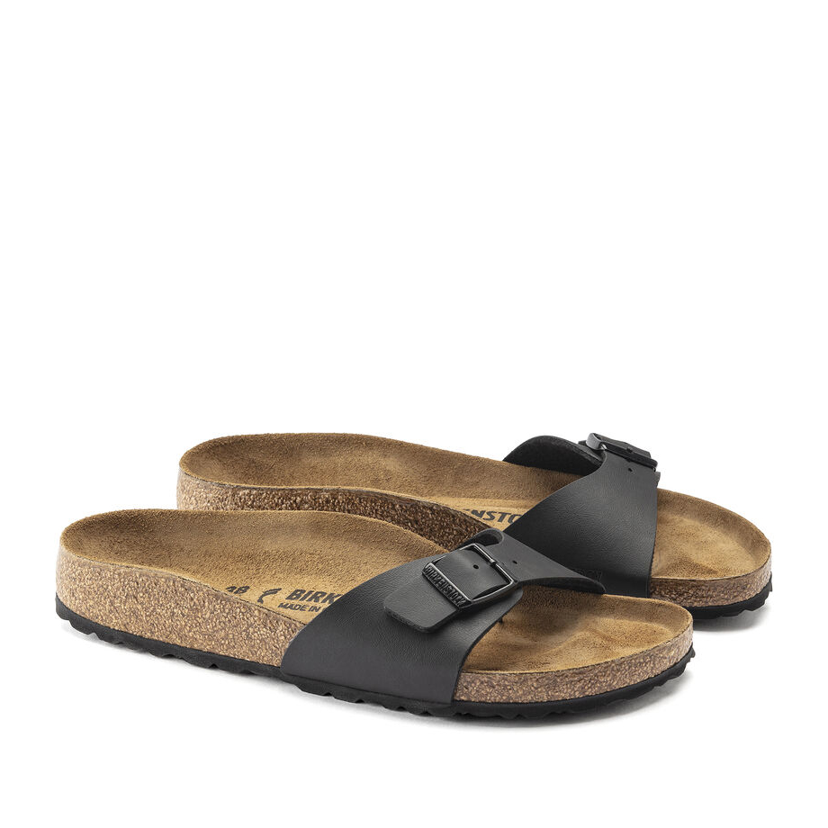 Birkenstock Madrid Birko Flor black. La pianella BIRKENSTOCK Madrid è il primissimo modello della grande famiglia BIRKENSTOCK e, a ragione, è considerata un vero classico. Lanciata mezzo secolo fa sul mercato come "pianella da ginnastica", questo modello a cinturino unico dalle linee essenziali è diventato ora una vera icona di moda. La tomaia è in materiale sintetico Birko-Flor® dermoaffine e resistente.