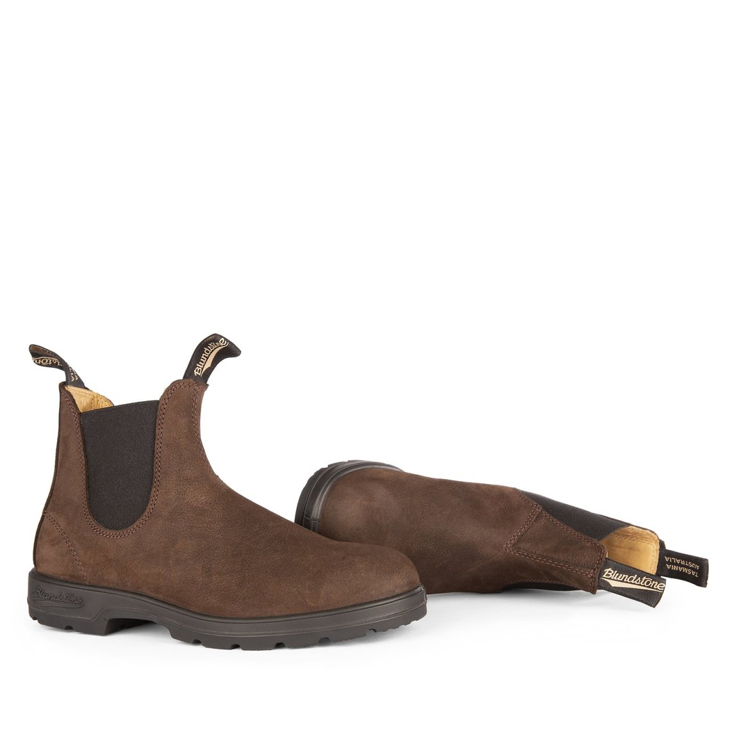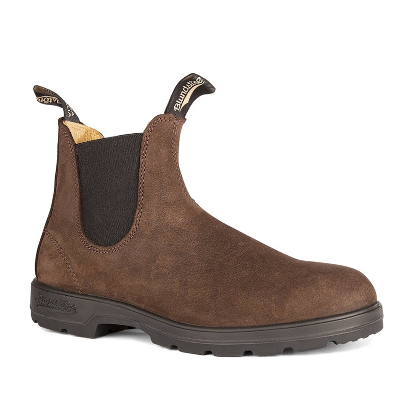 Stivaletti in stile Chelsea modello Blundstone #1606, realizzati in nabuk marrone resistente all'acqua con elastici laterali neri. Comoda linguetta frontale e posteriore per aiutarvi nella calzata, suola in gomma dentata con tallone rialzato e dall’ottimo grip. Una scarpa must have del guardaroba raffinato della serie Classics, comoda e resistente per look casual chic e più formali.