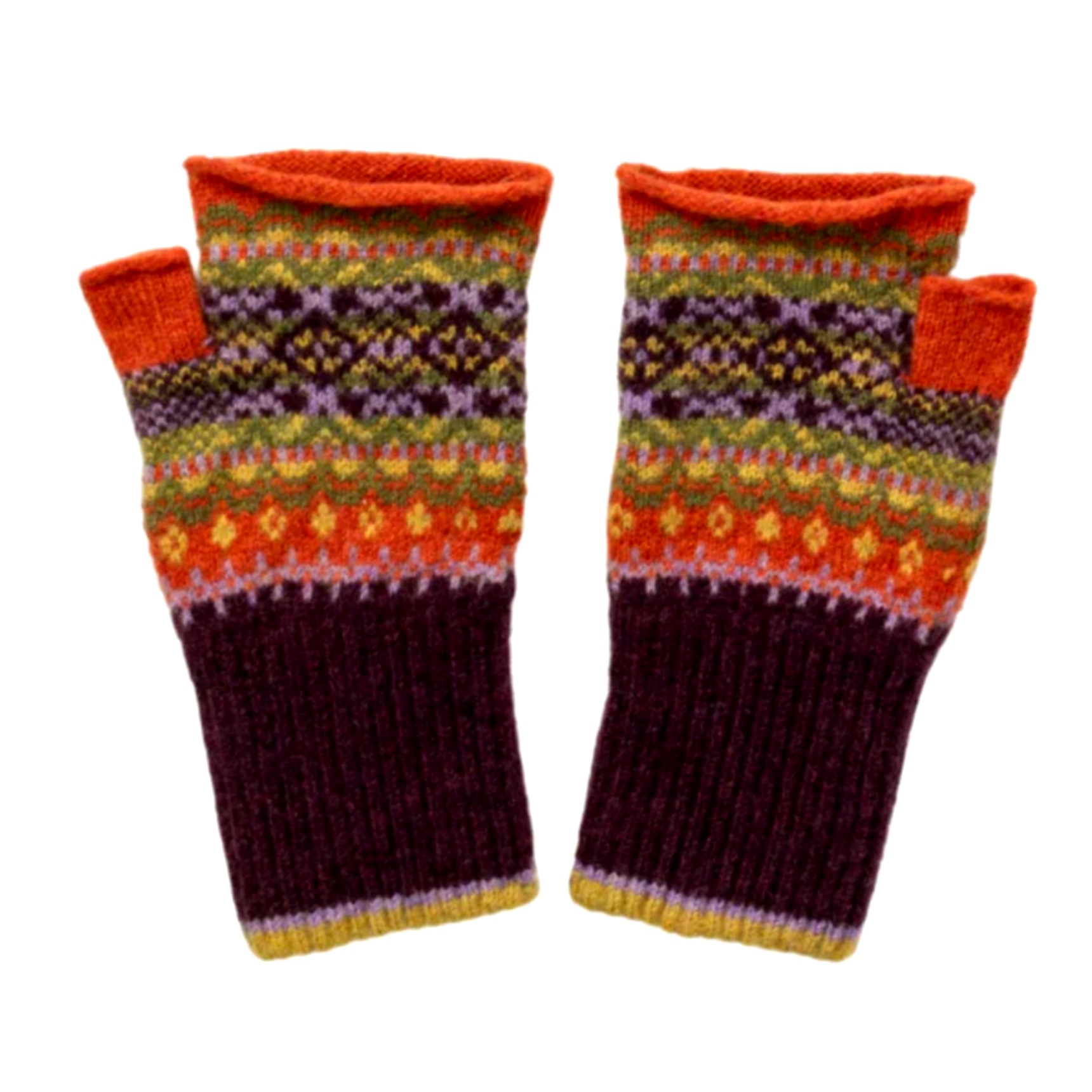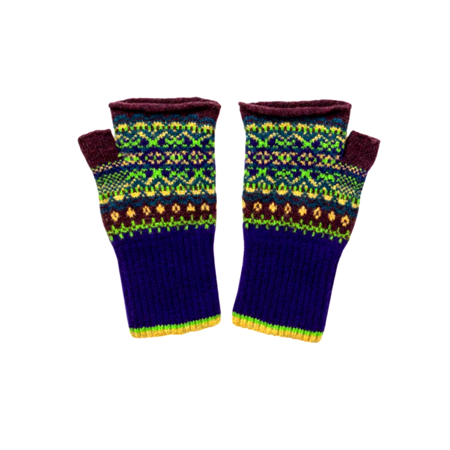 Lana Merino 100% luminosa e colorata, cosa si può chiedere di più? Con geometrie audaci e decori Fairisle in colori a contrasto, questi guanti aperti hanno un polsino interno colorato nascosto. Perfetti per tenere le mani al caldo e pratici. Realizzati in Scozia con lana Merino 100%.