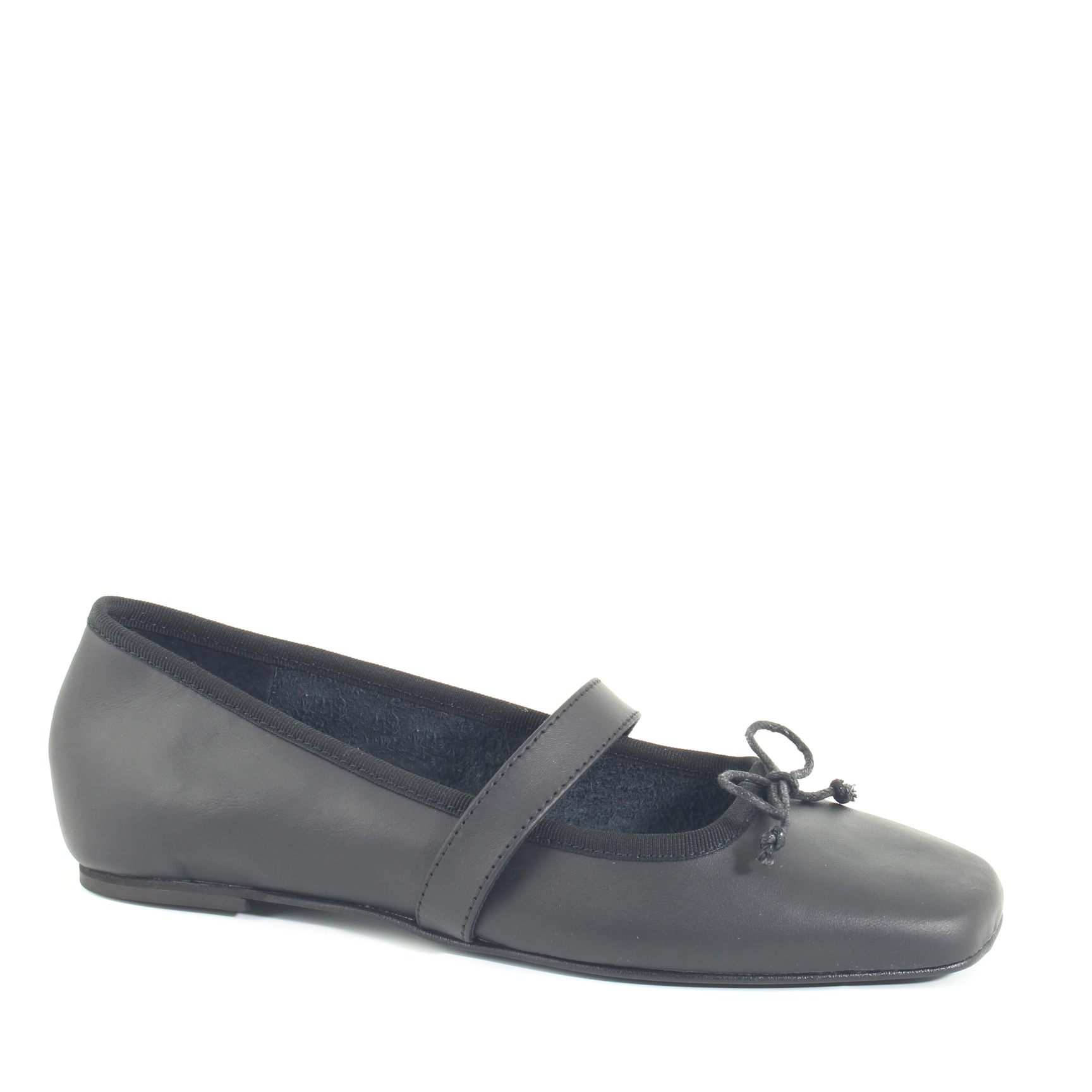 Un'elegante ballerina in pelle nera con una punta squadrata e un tocco di grazia. Il fiocchetto posizionato con precisione e la fascetta sul collo del piede la rendono un mix perfetto tra stile e comfort. La tua danza diventa un'opera d'arte con questi piccoli ma affascinanti dettagli.