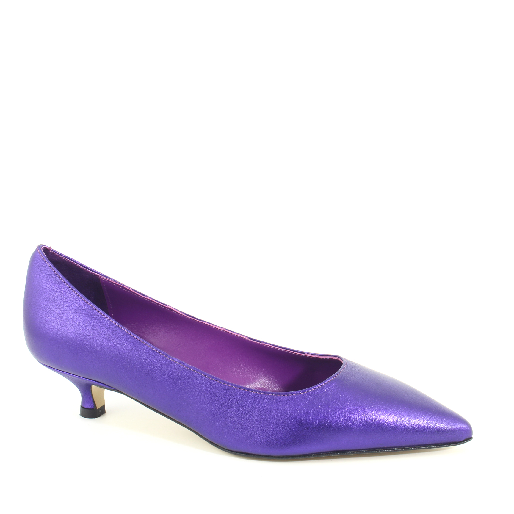 Dècolletè tacco basso, forma a punta. La dècolletè tacco 3 cm è un vero passe-partout da indossare con look giornalieri e casual. Il modello Ilene viola è proposto in laminato con fodera in pelle e suola in tunith. Se desideri una scarpa dècolletè in alternativa alla ballerina bassa, questo è il modello che fa al caso tuo. Realizzata artigianalmente in Italia.