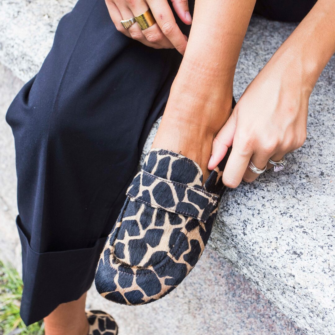Jeans skinny neri, maglione neutro e blazer corto. Il mocassino giraffa diventa il dettaglio che accende il look minimal, catturando lo sguardo senza esagerare.