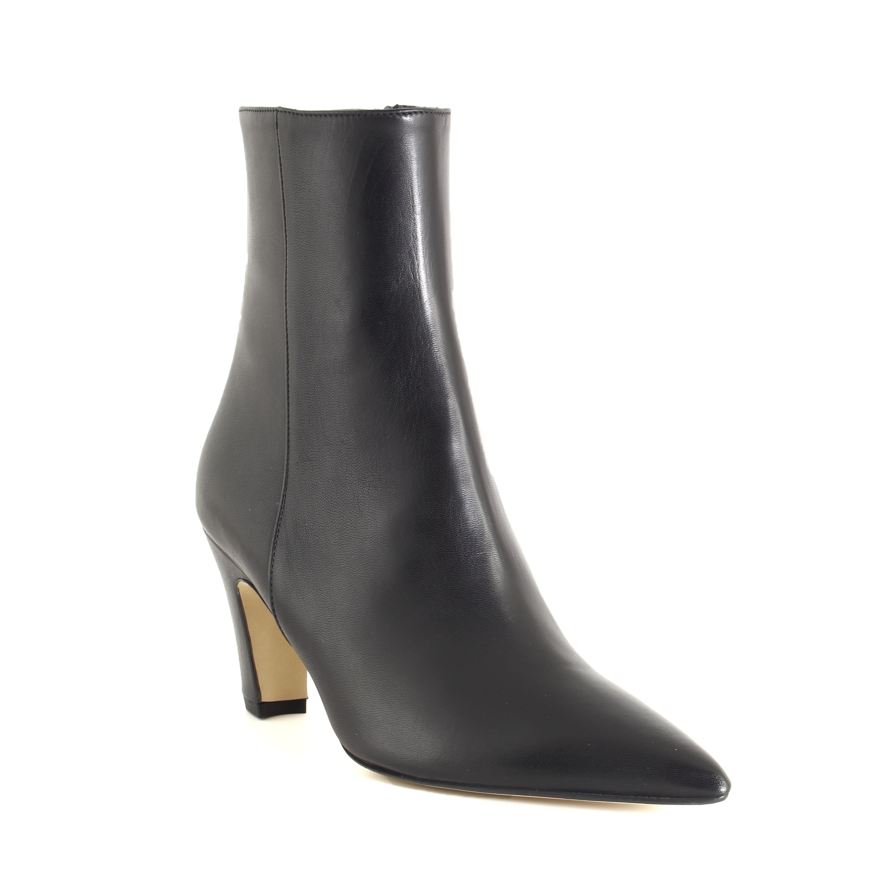 Il design è arricchito da una zip laterale, pratica e discreta, che facilita la calzata senza compromettere l’eleganza della silhouette. La pelle nera morbida e resistente avvolge il piede in modo confortevole, mentre il tacco solido e la suola in gomma assicurano stabilità e sicurezza ad ogni passo.