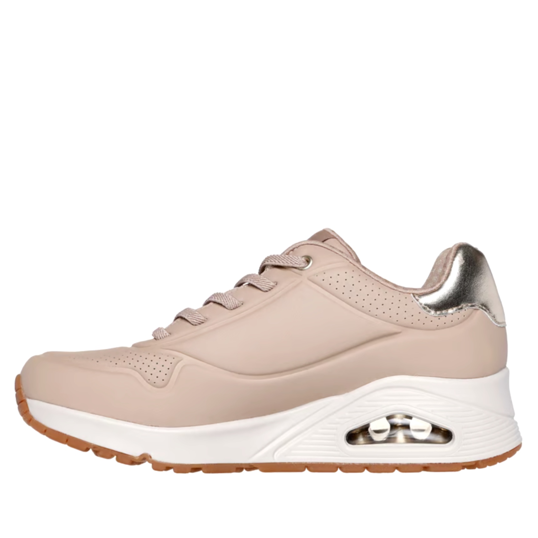 Indossa un modello classico in tutta comodità con la Skechers Street™ Uno - Shimmer Away. Questa sneaker di tendenza presenta una tomaia in materiale sintetico durabuck con finitura metallizzata, lacci elasticizzati, soletta Skechers Air Cooled Memory Foam® e intersuola ammortizzata ad aria con tecnologia visibile Skech-Air®